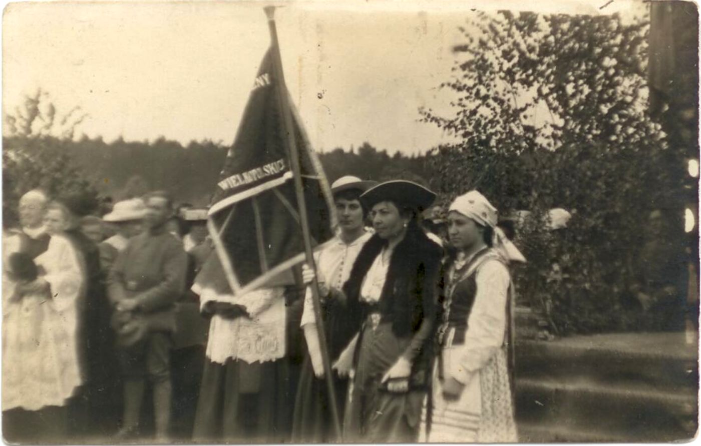 Sztandar 3. pułku strzelców wielkopolskich w trakcie uroczystości poświęcenia. Biedrusko 29 maja 1919 r. Wśród matek chrzestnych córka generała Dowbora Muśnickiego - Janina (pierwsza od prawej). -