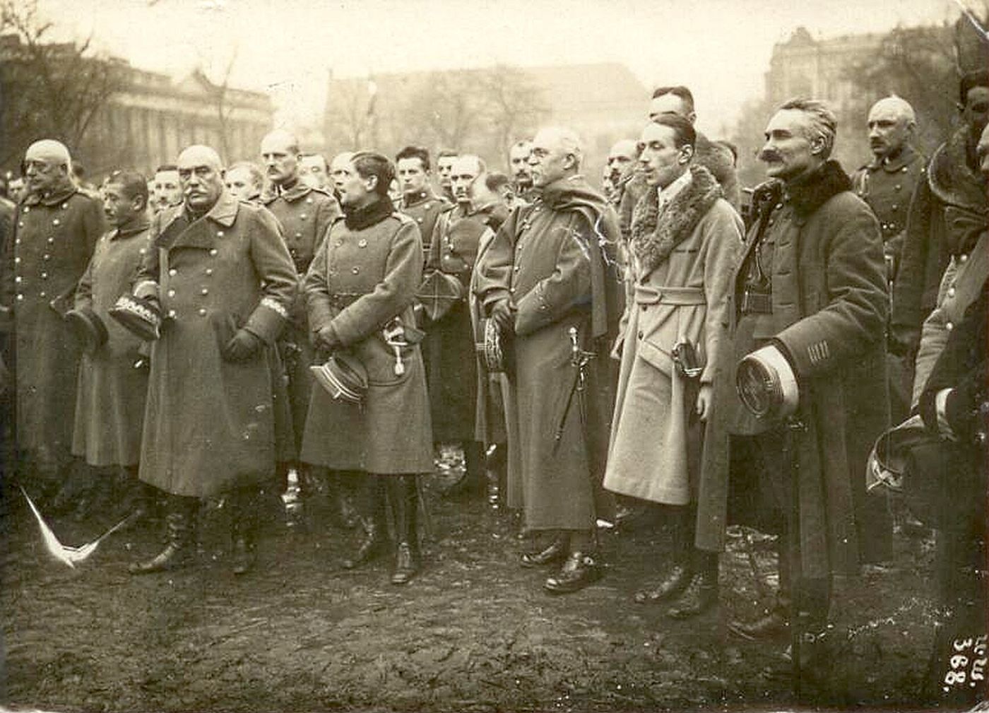 Generał Konarzewski (dowódca 1. DSW) i pułkownik Paszkiewicz (dowódca 1. psw) w trakcie pogrzebu poległych żołnierzy pułku. Bobrujsk, listopad 1919 r. -