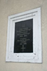 Na frontowej ścianie ratusza, przy południowo-zachodnim narożniku, widnieje niewielka czarna tablica z 1959 r.