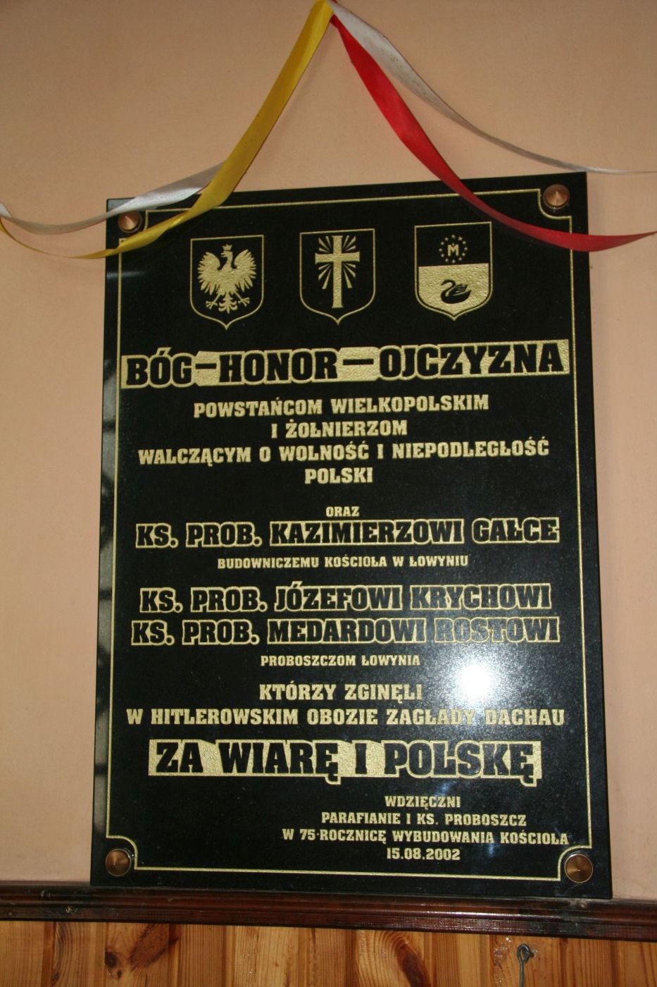1-2. W kruchcie kościoła parafialnego 15 VIII 2002 r., w 75-lecie wybudowania świątyni, odsłonięto czarną tablicę kamienną ku czci powstańców wielkopolskich, żołnierzy walczących o wolność i niepodległość oraz trzech tutejszych proboszczów zamęczonych w obozie hitlerowskim w Dachau. Zdobią ją orzeł w koronie, krzyż i herb Łowynia oraz napis Bóg – Honor – Ojczyzna. W 2004 r., w 85. rocznicę powstania wielkopolskiego, w kruchcie umieszczono drugą tablicę, dekorowaną wizerunkami polskiego orła oraz krzyży powstańczego i Virtuti Militari. Wypisano na niej nazwiska 13 uczestników powstania z Łowynia.