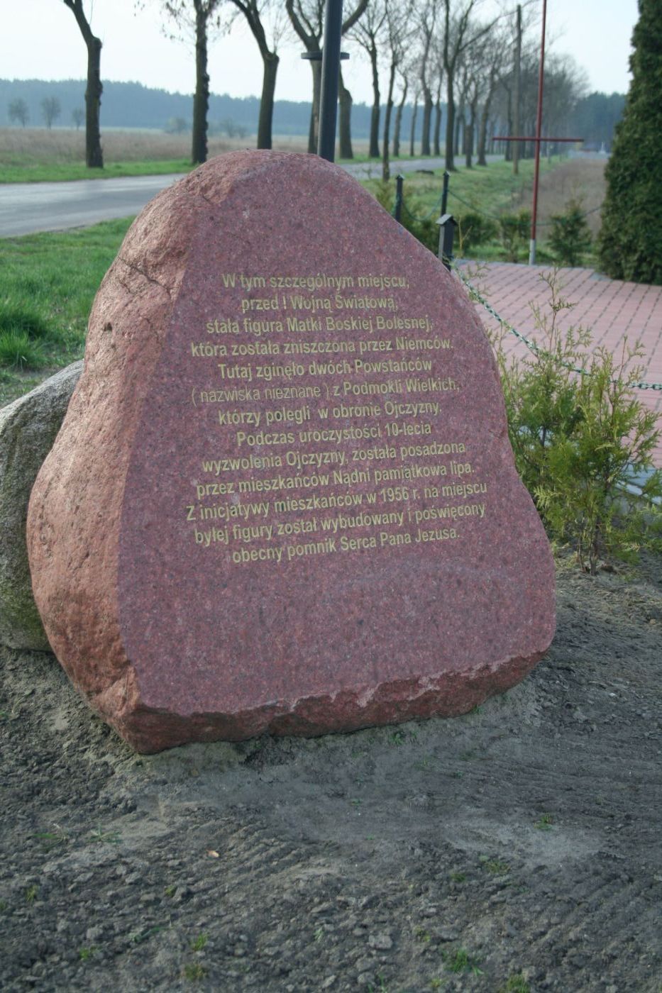 Na południowym skraju wsi, obok figury Serca Jezusowego, w 2008 r. ustawiono głaz narzutowy – czerwony granit. Na jego polerowanej przedniej części wypisano historię tego szczególnego miejsca. Tu dwaj nieznani z nazwiska powstańcy z Podmokli Wielkich polegli w obronie Ojczyzny. Dla ich upamiętnienia w 10-lecie odzyskania niepodległości posadzono pamiątkową lipę (nie zachowała się), a w 1956 r. postawiono obecną figurę.