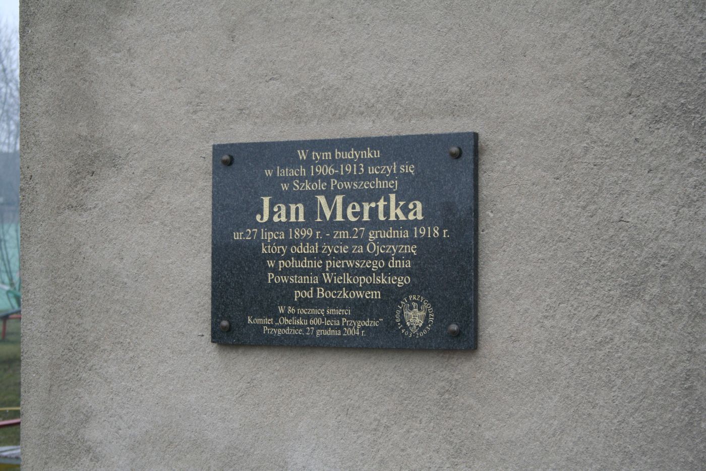 3. Na budynku przedszkola (dawnej szkole, ul. Szkolna 4) znajduje się kamienna tablica upamiętniająca fakt, że tu w latach 1906-13 uczył się Jan Mertka (patrz Boczków). Odsłonięto ją w 86. rocznicę śmierci bohatera.