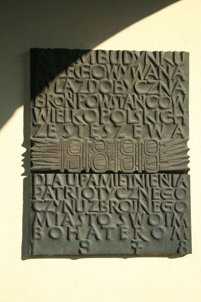 2. Na frontowej ścianie podcieniowego domku przy Rynku 8, w którym mieści się Muzeum Regionalne, w 1978 r. odsłonięto metalową tablicę projektu Józefa Kopczyńskiego. Upamiętnia ona fakt przechowywania w tym budynku zdobycznej broni powstańców wielkopolskich ze Stęszewa.