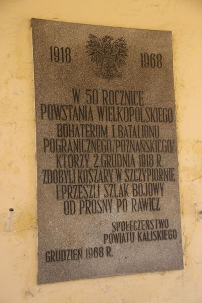 Na dawnych koszarach celnych (ul. Wrocławska 195), w podcieniu prawego niższego pawilonu, znajduje się (przeniesiona niedawno ze ściany od strony ulicy) tablica marmurowa, ufundowana w grudniu 1968 r. przez społeczeństwo powiatu kaliskiego. Upamiętnia ona I Batalion Pograniczny, który 2 XII 1918 r. zdobył te koszary na Niemcach, a potem w powstaniu wielkopolskim przeszedł szlak od Prosny po Rawicz. Zastępuje ona odsłoniętą 12 V 1937 r. tablicę ku czci Jana Mertki (patrz Boczków), którą zniszczyli hitlerowcy.