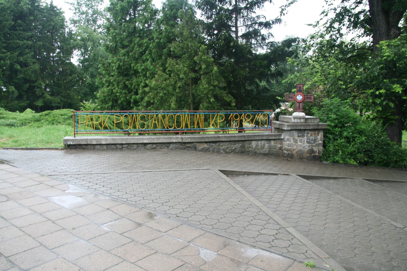 2. Przy wejściu do tego parku od strony ul. Poznańskiej umieszczono na zwieńczeniu muru z kostek granitowych brązowy krzyż powstańczy, który w latach 1961-69 znajdował się na cokole obecnego pomnika powstańca-dobosza.