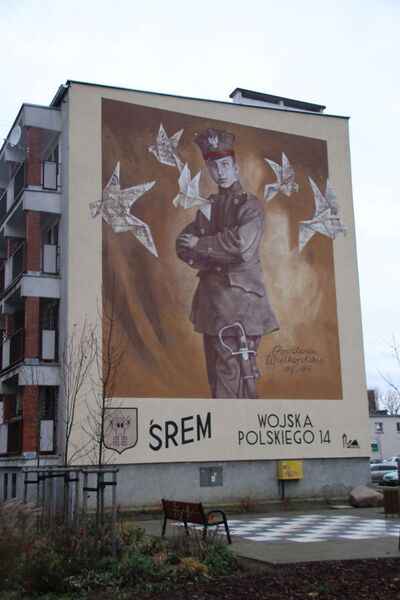 7. Na szczytowej ścianie bloku mieszkalnego przy ul. Wojska Polskiego 14 w 2016 r. wykonano mural przedstawiający powstańca w mundurze, wokół którego krążą papierowe ptaki wykonane z listów wymienianych z rodzinami.