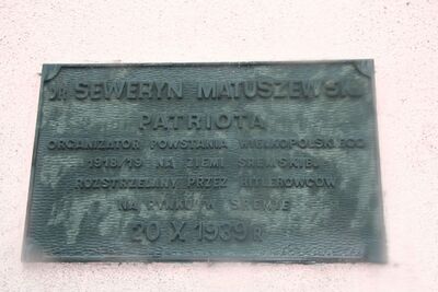 3. Organizatorem powstania wielkopolskiego w powiecie śremskim był Seweryn Matuszewski (1879-1939), lekarz i działacz narodowy. Został rozstrzelany przez hitlerowców 20 X 1939 r. na rynku w Śremie. Jego postać upamiętnia tablica metalowa, wmurowana 28 XII 1978 r. w ścianę kamienicy nr 2 przy ulicy nazwanej jego imieniem.